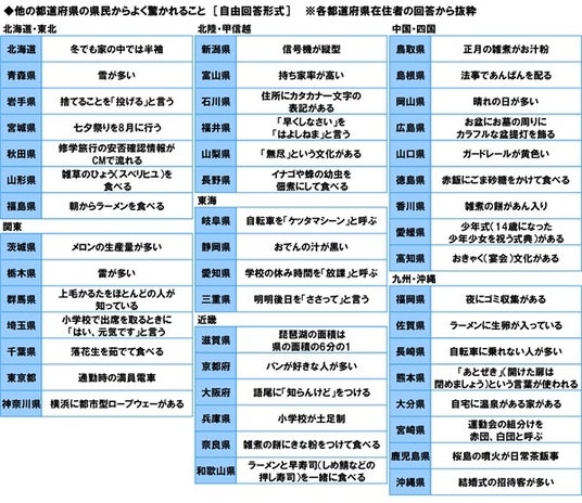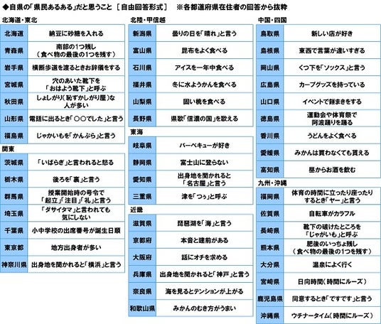 山形県「電話に出るとき『○○でした』と言う」、福井県「冬に水ようかんを食べる」、三重県「津を『つぅ』と呼ぶ」、滋賀県「琵琶湖を『海』と言う」、大阪府「話にオチを求める」、和歌山県「みかんのむき方がうまい」、鳥取県「新しい店が好き」、佐賀県「自転車がカラフル」、長崎県「靴下の破けたところを『じゃがいも』と呼ぶ」