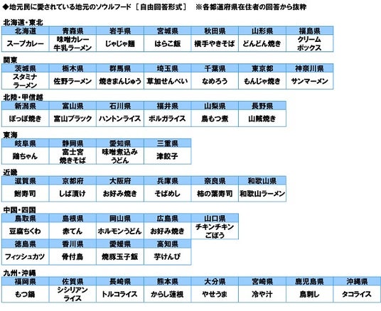 各都道府県の在住者(各都道府県100名)に、地元民に愛されている地元のソウルフードを聞いたところ、青森県では「味噌カレー牛乳ラーメン」、宮城県では「はらこ飯」、秋田県では「横手やきそば」、茨城県では「スタミナラーメン」、栃木県では「佐野ラーメン」、千葉県では「なめろう」、神奈川県では「サンマーメン」、石川県では「ハントンライス」、福井県では「ボルガライス」、山梨県では「鳥もつ煮」、三重県では「津餃子」、滋賀県では「鮒寿司」、兵庫県では「そばめし」、鳥取県では「豆腐ちくわ」、島根県では「赤てん」、岡山県では「ホルモンうどん」、山口県では「チキンチキンごぼう」、徳島県では「フィッシュカツ」、香川県では「骨付鳥」、愛媛県では「焼豚玉子飯」、福岡県では「もつ鍋」、長崎県では「トルコライス」、熊本県では「からし蓮根」、大分県では「やせうま」、宮崎県では「冷や汁」、鹿児島県では「鳥刺し」といった回答がみられました。(図29)