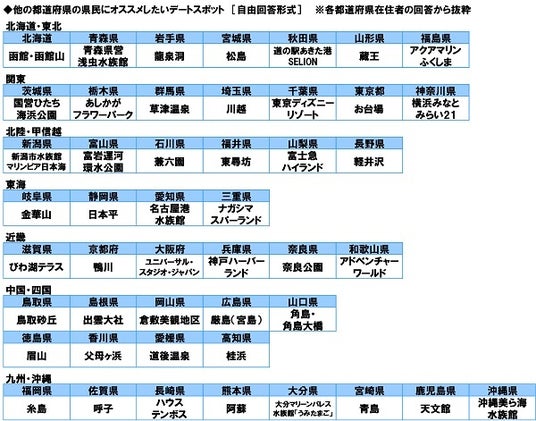 ◆他の都道府県の県民にオススメしたいデートスポット 北海道「函館・函館山」、岩手県「龍泉洞」、宮城県「松島」、茨城県「国営ひたち海浜公園」、群馬県「草津温泉」、埼玉県「川越」、石川県「兼六園」、福井県「東尋坊」、三重県「ナガシマスパーランド」、滋賀県「びわ湖テラス」、兵庫県「神戸ハーバーランド」、広島県「厳島(宮島)」、山口県「角島・角島大橋」、愛媛県「道後温泉」、長崎県「ハウステンボス」