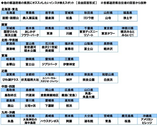 ◆他の都道府県の県民にオススメしたいインスタ映えスポット 秋田県「ゴジラ岩」、福島県「浄土平」、栃木県「あしかがフラワーパーク」、東京都「東京タワー」、石川県「金沢21世紀美術館」、長野県「軽井沢」、京都府「伏見稲荷大社」、大阪府「ユニバーサル・スタジオ・ジャパン」、愛媛県「下灘駅」、高知県「桂浜」、福岡県「糸島」、佐賀県「大魚神社の海中鳥居」、熊本県「阿蘇」、沖縄県「アメリカンビレッジ」