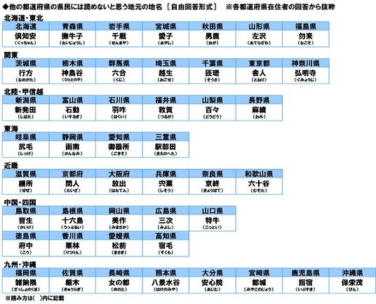 各都道府県の在住者(各都道府県100名)に、他の都道府県の県民には読めないと思う地元の地名を聞いたところ、北海道では「倶知安」、青森県では「撫牛子」、山形県では「左沢」、栃木県では「神鳥谷」、千葉県では「匝瑳」、神奈川県では「弘明寺」、富山県では「石動」、山梨県では「百々」、長野県では「麻績」、岐阜県では「尻毛」、愛知県では「御器所」、京都府では「間人」、大阪府では「放出」、奈良県では「京終」、島根県では「十六島」、岡山県では「美作」、徳島県では「府中」、香川県では「栗林」、高知県では「宿毛」、福岡県では「雑餉隈」、長崎県では「女の都」、熊本県では「八景水谷」、宮崎県では「都城」といった回答がみられました。(図30)