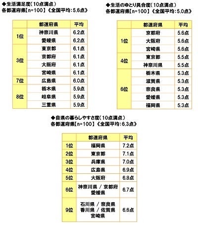 ◆生活のゆとり具合度の自己評価 平均点1位は「京都府」「大阪府」「宮崎県」5.6点