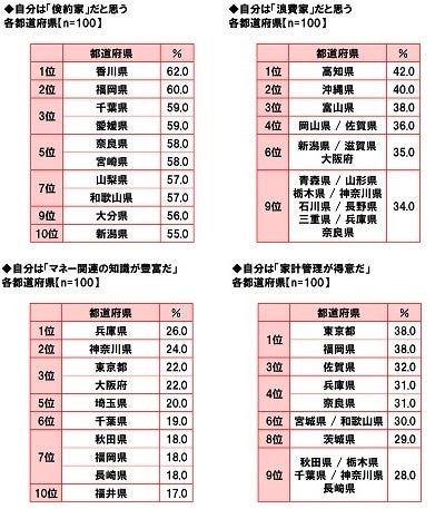 ◆“マネー知識が豊富”1位は「兵庫県」、“家計管理が得意”1位は「東京都」「福岡県」