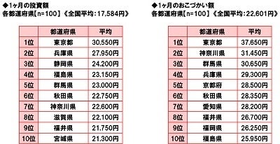 投資額についてみると、1ヶ月の投資額の平均は、1位「東京都」(30,550円)、2位「兵庫県」(27,950円)、3位「静岡県」(24,200円)となりました。(図47)