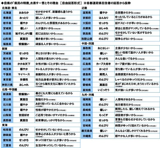 複数の都道府県で挙げられた回答をみると、岩手県、栃木県、埼玉県、石川県、福井県、静岡県、滋賀県では「穏やか」、青森県と山口県では「おっとり」、岐阜県、三重県、奈良県、和歌山県、香川県、佐賀県、宮崎県、沖縄県では「のんびり」、茨城県、愛知県、大阪府、岡山県、大分県では「せっかち」、山形県、富山県、長野県、愛媛県では「真面目」、宮城県、島根県、福岡県、長崎県、鹿児島県では「優しい」、福島県と新潟県では「我慢強い」、神奈川県と兵庫県では「おしゃれ」といった回答がみられました。