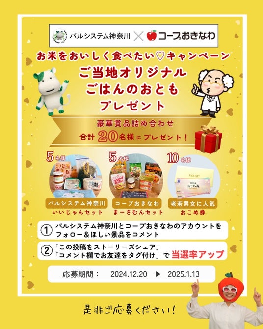 生活協同組合パルシステム神奈川(本部:横浜市港北区新横浜、理事長:藤田順子)と生活協同組合コープおきなわ(本部:浦添市西原、古堅忠司理事長)は12月20日(金)から1月13日(月)まで、Instagramでフォローキャンペーンを実施します。2025年の国際協同組合年目前の生協間コラボで、消費の力で米生産者を応援する神奈川、沖縄のご当地「ごはんのおとも」詰め合わせやおこめ券を抽選で20人にプレゼントします。