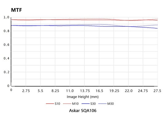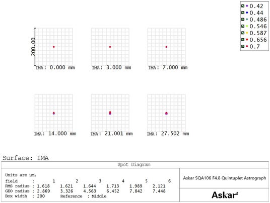 ・中心スポット半径は設計値で1.6μm、イメージサークル55mmの最周辺でも2.1μmという、これまでの天体望遠鏡とは一線を画す驚異的な結像性能を誇ります。