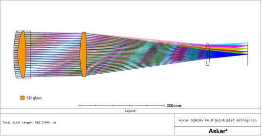 ・対物レンズ口径106mm、5群5枚のレンズ構成のうち、2枚にSD(超特殊低分散)レンズを使用したペッツバールデザインの光学系が採用されています。