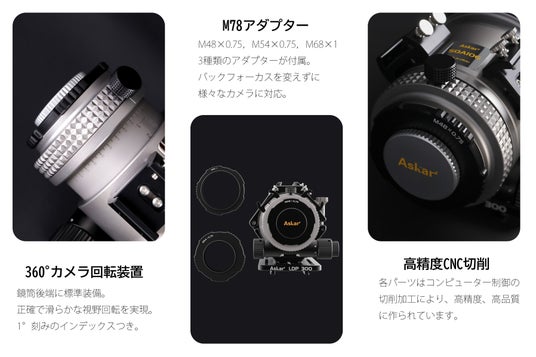・接眼部後端のM78アダプターは、径の異なる「M48×0.75mm」「M54×0.75mm」「M68×1.0mm」の3種類が付属しています。アダプターを交換することで光路長を変えることなく、お使いの機材に合わせた接続をおこなうことができます。