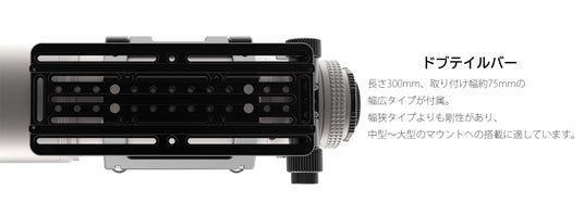 ・汎用性の高い全長300mm×底幅75mmの幅広ドブテイルバーを採用しており、様々なマウントへ搭載が可能です。カメラやアクセサリーの取り付け状態に応じて、前後へのバランス調整が柔軟におこなえます。
