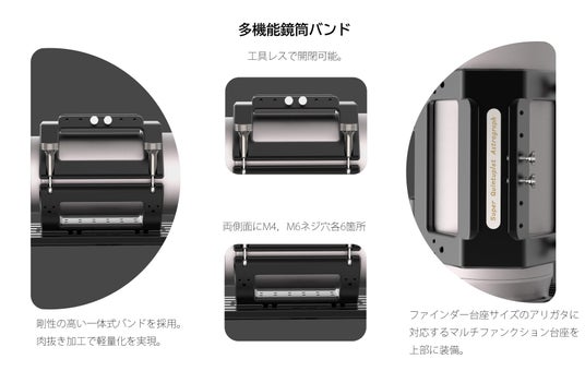 ・CNC加工で精密に削り出された多機能鏡筒バンドは、全長170mmの一体式になっています。十分に軸間をとることによって、軽量でありながら捻れや撓みに強く、安定性と可搬性に優れています。