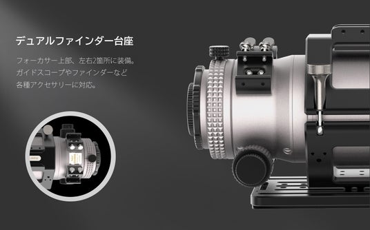 ・ファインダー台座は接眼部の上部左右に2つ搭載されています。ガイドスコープとファインダーやその他のアクセサリーを同時に搭載することが可能です。鏡筒バンド上部にも、ファインダー台座に対応するアクセサリーを取り付け可能なアリミゾが設けられており、合計で3箇所同時にアクセサリーを取り付けることが可能です。