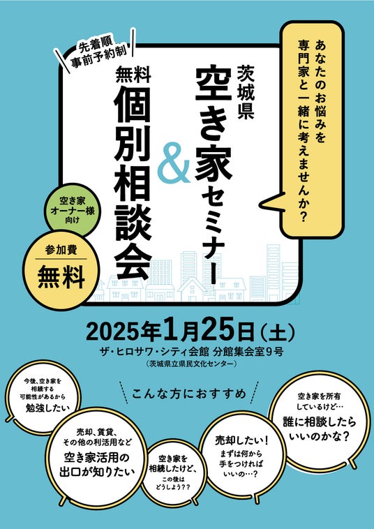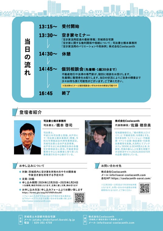 茨城県と、茨城県を中心に「地域から価値をつくる」ことを掲げ活動する、株式会社Coelacanth(シーラカンス)(本社:茨城県 東茨城郡大洗町、代表:佐藤 穂奈美 以下「当社」)は、空き家対策の一環として、空き家オーナー向けに「空き家セミナー&個別相談会を開催いたします。