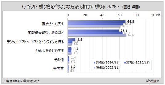 直近1年間に贈り物をした人に、どのような方法で相手に贈ったかを聞いたところ(複数回答)、「直接会って渡す」が66.8%、「宅配便や郵送、振込など」が59.1%です。