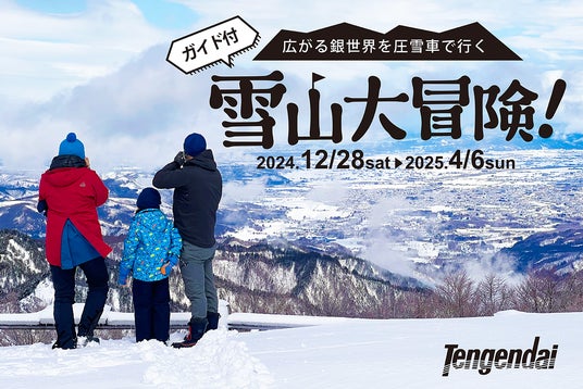 山形県米沢市のスキー場・天元台高原で「雪山大冒険」が12月28日(土)にスタートする。圧雪車に乗車し、雪に閉ざされた冬山に向かって探検する人気企画で、今年は秘境を独占できる貸切プランを設定。今シーズンの開催期間は2025年4月6日(日)まで。