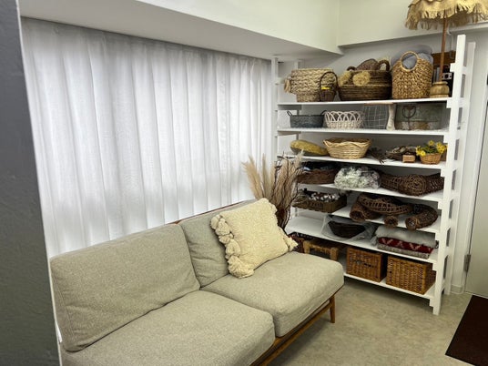 『studioコウノトリ』の様子、撮影に使用する小物やご家族が撮影の様子を見守るソファ(オムツやミルクの調乳用にウォーターサーバーも完備)
