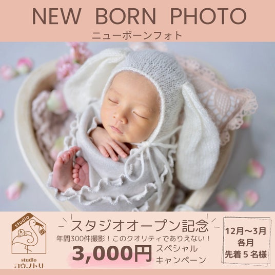 株式会社Over the moon(東京都葛飾区 代表取締役 大場沙織)は、『studioコウノトリ』オープン記念としてニューボーンフォト撮影『3,000円スペシャルキャンペーン』をスタートしました。