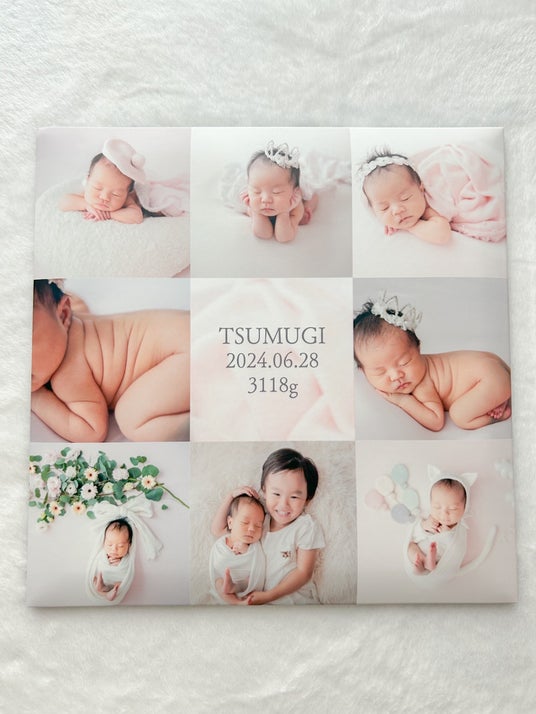 お客様と写真の配置など時間をかけて打ち合わせをして完成したパネルの一例 毎日眺めて育児のお守りに