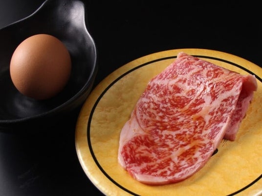 [六大名物]黒毛和牛のとろける炙りロース~月見落とし~