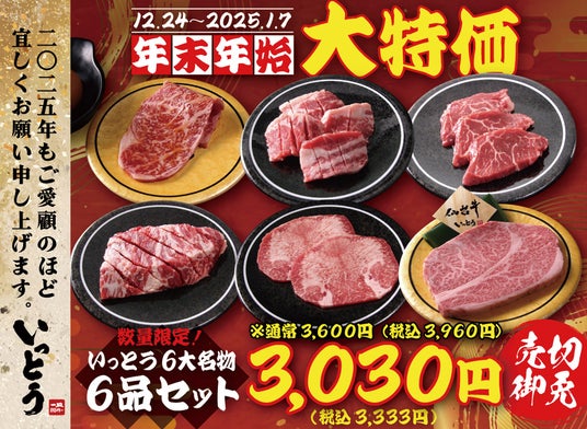 「廻転レーン焼肉いっとう」では、12月24日(火)~1月7日(火)まで、当店おすすめの六大名物焼肉6品セットを年末年始特別価格で販売いたします。ご家族やご友人との年末年始のハレの日のご利用の際にぜひ当店のおすすめメニューをお求めやすい価格でお楽しみいただきたいという想いで今回の企画を実施いたします。さらに1月1日(祝)~1月3日(金)限定でスペシャルな和牛もお求めやすい価格で販売いたします。