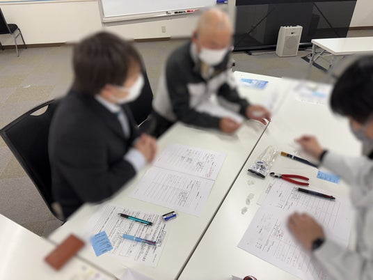 用意した模擬作業を使って正しい教え方の検討をグループで行っている様子