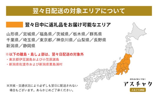 翌日配送が可能な地域は、山形県、宮城県、福島県、茨城県、栃木県、群馬県、埼玉県、千葉県、東京都、神奈川県、山梨県、長野県、新潟県、静岡県の1都13県で、お礼の品をいち早くお届けいたします。