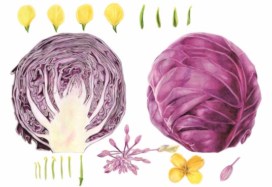 瑞々しい感性によって、ムラサキキャベツの特徴をよく観察して表現している。特に、結球の表面と葉が密に詰まった断面の特徴、緑色のキャベツでは見られない紫色のつぼみと黄色い花弁の対比、立体感などが誠実に表現されている。色鉛筆で滑らかに描くことは難しいが、それをうまく克服して色鉛筆の特性を生かしている。結球と花を描くためのスケジュールもよく考えていたことも伺え、完成度の高い作品と言える。