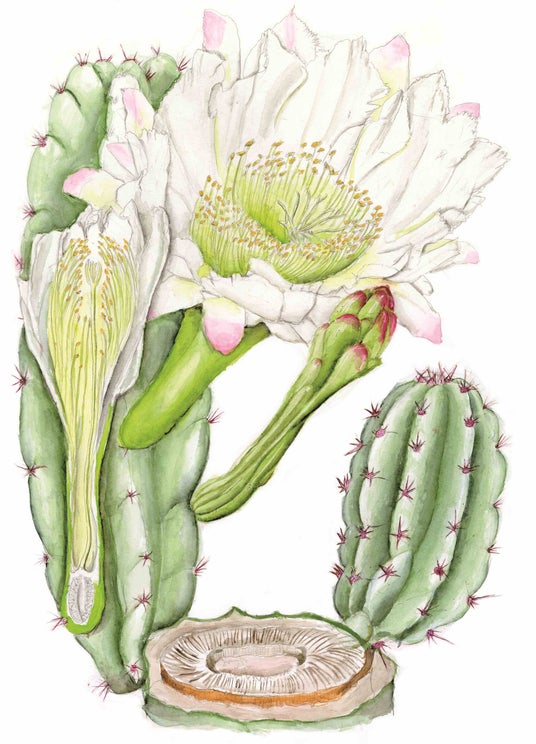 各部分を画面いっぱいにバランスよく配置し、花の断面を茎に重ねて立体感を出すことで迫力のある作品になっている。茎の切り口を取り入れて維管束の状態を見せるとともに、その縁から枝分かれしている茎を描くことで植物の生命力が表現されている。花を詳細に描くことでその美しさを表現している。また、この植物の立体感や調和のある美しさを感じとって画面全体がバランスよく、美しい構成になっている。