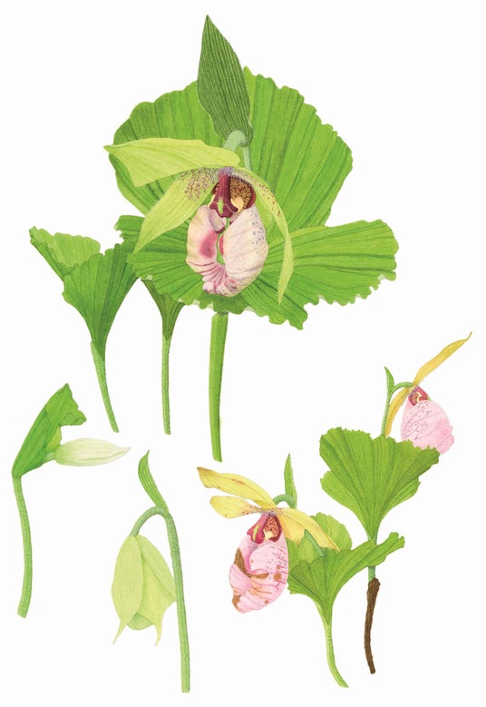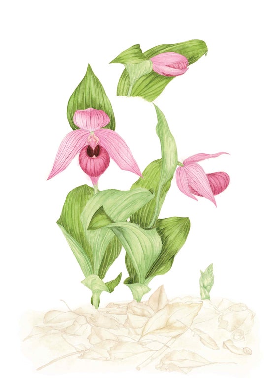 自在な画面構成のなかにホテイアツモリソウの特徴が盛り込まれており、精密な描写とともに植物画の要素を十分に満たしている。この植物を現地でスケッチすることは大変だが、その特徴を目立たせるために落ち葉を着色しないなどの自分なりの工夫をしていて、植物の自然の雰囲気がよく表現されている。特に、繊細に描かれた葉脈などから生命感が感じられ、植物に素直に向き合い、その美しさを感じながら描かれている。