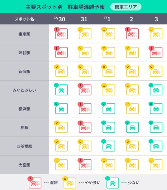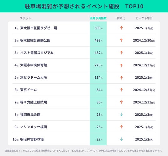 最も駐車場の混雑が予想されるイベント施設は「東大阪市花園ラグビー場」(大阪府、500%)で、1月3日(金)がピークとなる見込みです。次いで、「栃木県総合運動公園」(栃木県、498%、12月30日(月))、「ベスト電器スタジアム」(福岡県、482%、1月1日(水))が混雑する予想となっています。年末年始期間中は年越しライブやスポーツの試合等さまざまなイベントが開催され、周辺の駐車場は混雑が予想されます。