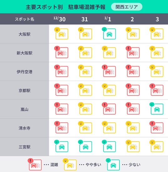 最も駐車場の混雑が予想される空港・ターミナル駅は「大阪国際空港(伊丹空港)」(大阪府、119%)で、1月1日(水)がピークとなる見込みです。次いで、「関西国際空港」(大阪府、97%、12月30日(月))、「羽田空港」(東京都、89%、1月1日(水))と続く予想となっています。帰省や旅行等で数日間にわたって駐車場を利用される方も多いことから、空港周辺、ターミナル駅周辺の駐車場は混雑が予想されます。