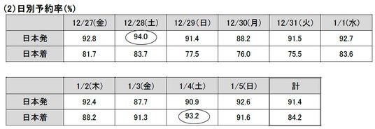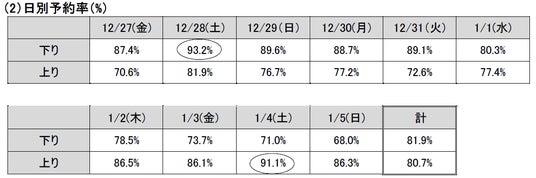 - 期間中は、下りが12月28日をピークに12月31日まで予約率の高い日が続いています。上りは1月4日をピークに、予約率の高い日が続いています。