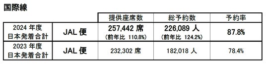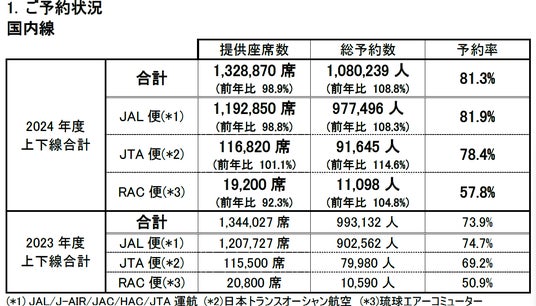 2024年度年末年始期間(2024年12月27日~2025年1月5日)について、JALグループ航空会社のご予約状況を取りまとめましたので、ご報告します。なお、国内線・国際線ともに2020年以降、期間中の予約率が最高値となりました。