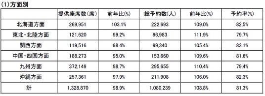 - 予約数は前年を超えて推移しています。方面別では、特に、北海道・関西・中国四国・沖縄方面が好調に推移しています。