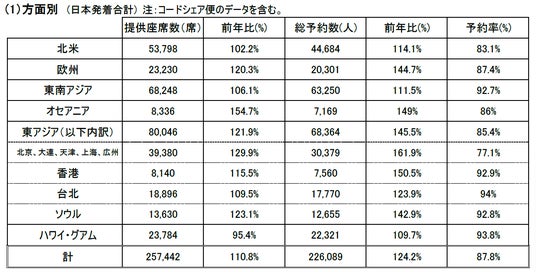 - 予約数は全方面で前年を大きく上回り、全方面で好調に推移しています。方面別では特に、東アジア路線が前年を大きく上回るご予約をいただいております。