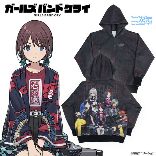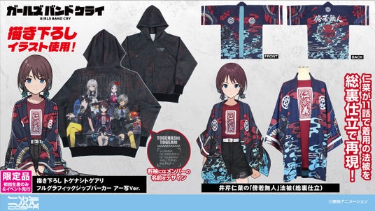 アニメ『ガールズバンドクライ』より、アー写をイメージしたトゲナシトゲアリの「描き下ろし トゲナシトゲアリ フルグラフィックジップパーカー アー写Ver.」をはじめ、仁菜が11話で着用の法被を総裏仕立で再現した「井芹仁菜の「傍若無人」法被(総裏仕立)」、キャラクターデザインの手島nari氏がSNSに投稿した、海老塚智の着ている「ツンデレ Tシャツ」・ルパの着ている「酒豪Tシャツ」など、新グッズが二次元コスパからずらっと登場です。
