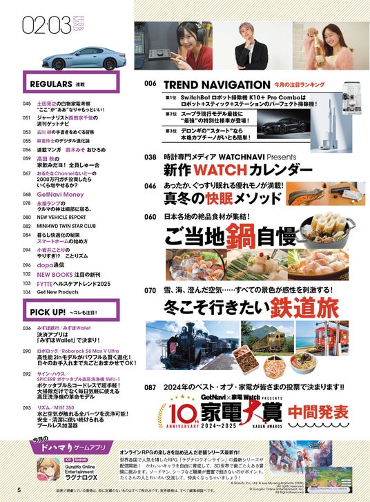 また、GetNavi×家電 Watch PRESENTS 家電大賞2024→2025の中間発表も。一般投票で家電の年間王者を決定する「家電大賞」がいよいよ大詰め。2024年12月16日時点での各部門トップ3を紹介します。投票締め切りは2025年1月6日いっぱいまで。