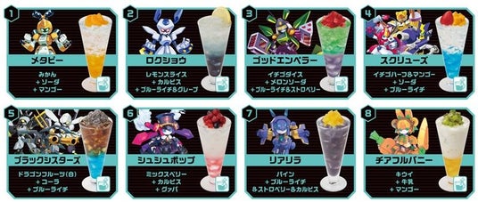 コラボドリンクは、「メダロット」をイメージした「メタビー」「ロクショウ」「ゴッドエンペラー」「スクリューズ」「ブラックシスターズ」「シュシュポップ」「リアリラ」「チアフルバニー」の全8種をご用意します。