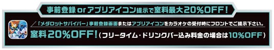 また、2025年2月リリース予定の新作スマートフォンゲーム「メダロットサバイバー」の事前登録画面またはアプリアイコンをカラオケの受付時にフロントでご提示いただくと、当日の室料が最大20%OFFに!
