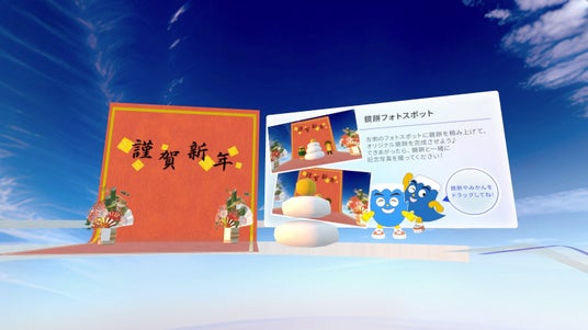 アバターを使って、巨大な鏡餅を自分で組み立てる体験ができます。完成した鏡餅はフォトスポットとしてもお楽しみいただけます。ぜひ、お餅を背景に記念撮影をしてください。