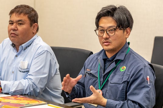 農家の喜びを語るJAおきなわ 八重山地区営農振興センター 山田泰大さん(右)、マンゴー生産部会長 伊志嶺雅也さん(左)