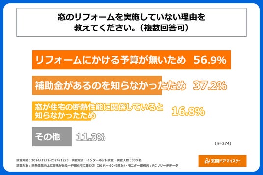 また、断熱性能向上を目的に住宅の窓をリフォームしたことがないと回答された方に「窓のリフォームを実施していない理由」を尋ねる設問の回答で多かったのは、1位が「リフォームにかける予算が無いため」で56.9%、2位が「補助金があるのを知らなかったため」で37.2%という結果になりました。この結果から、窓のリフォームを実施していない主な理由として費用面の大きさがあることが明らかになりました。