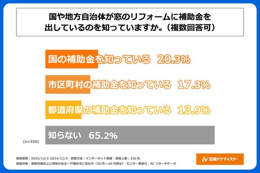 次に「国や地方自治体が窓のリフォームに補助金を出しているのを知っているか」を尋ねる設問の回答では、1位が「知らない」で65.2%を占める結果となりました。この結果から住宅の断熱性能向上に興味がある人でも、6割以上の人が窓のリフォームに国や地方自治体が補助金を出している事実を知らない、ということが判明しました。