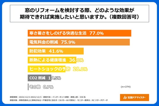続いて、断熱性能向上を目的に住宅の窓をリフォームしたことがないと回答された方に「窓のリフォームを検討する際、どのような効果が期待できれば実施したいと思うか」を尋ねる設問への回答で多かったのは、1位が「寒さ暑さをしのげる快適な生活」で77.0%、2位が「電気料金の削減」で75.9%、3位が「防犯効果」で41.6%という結果になりました。この結果から、住宅の断熱性能向上に興味がある人が窓のリフォームに最も期待することは「寒さ暑さをしのげる快適な生活」であることがわかりました。