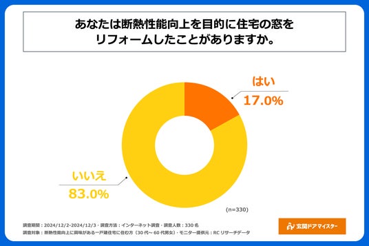 続いて「断熱性能向上を目的に住宅の窓のリフォームをしたことがあるか」を問う設問への回答では、「いいえ」が83.0%、「はい」で17.0%という結果になりました。この結果から、断熱性能向上に興味がある人でも、そのために窓のリフォームをしたことがある人は2割以下であることがわかりました。