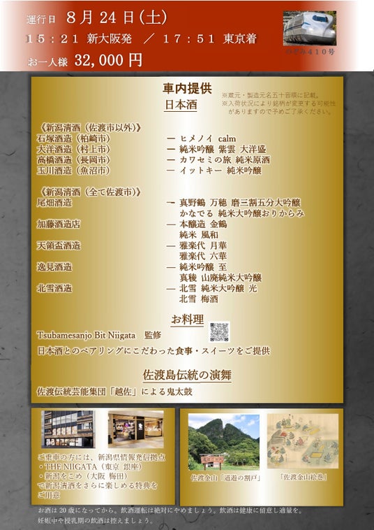 新潟県日本酒振興室では、2024年8月24日(土)、新潟のプレミアムな日本酒と厳選された食材による料理を堪能できるイベントを、東海道新幹線「のぞみ」の貸切車両で行います!