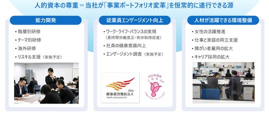 その組織戦略では、柔軟な事業転換を支える組織体質と人的資本の尊重を柱とし、能力開発や従業員エンゲージメント向上、そして人材が活躍できる環境整備を重要課題に位置づけています。