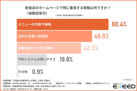 「飲食店のホームページで特に重視する情報は何ですか?」と質問したところ、『メニューの内容や価格(60.4%)』と回答した方が最も多く、『店内の写真や雰囲気(49.6%)』『営業時間やアクセス情報(42.3%)』と続きました。