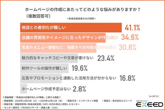 ホームページ作成時の悩みとして、自店舗の特徴を十分に表現することに課題を感じていることが明らかとなりました。
