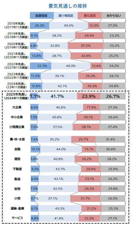 - 2025年の景気見通し、「回復」局面(7.7%)、「踊り場」局面(41.7%)は2024年の景気見通しからそれぞれ低下。他方、「悪化」局面(23.9%)は3.6ポイント上昇